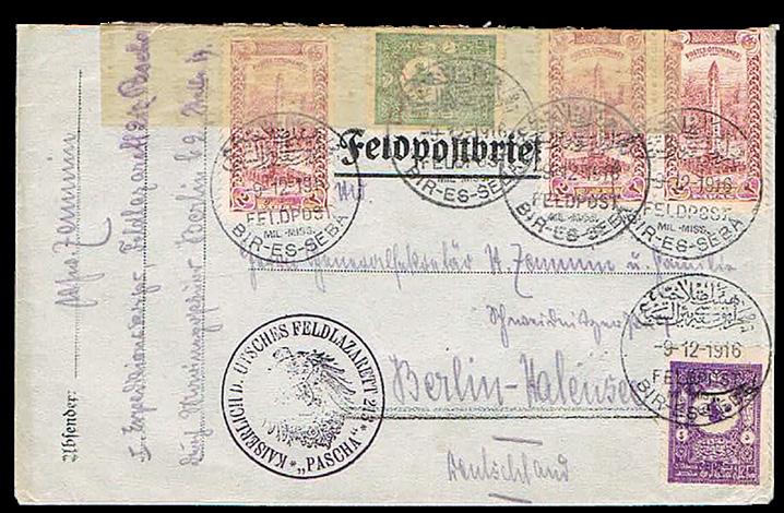 COVER mailed from Beer Sheva (Royal German Field Hospital 213), to Berlin (Halensee), Dec. 9, 1916, with Turkish stamps tied to cover by BIR-ES-SEBA by 5x cancels. Censored in Berlin Dec. 31, with transparent
