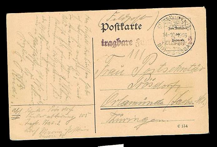 POSTKARTE ( Feldpost), to Germany with handstamp "TRAGBARE FUNKSTATION" (Mobile Radio Station) handstamp. October 16, 1916 BIR-ES-SEBA cancel. Photo. Estimated Value $200 (Image1)