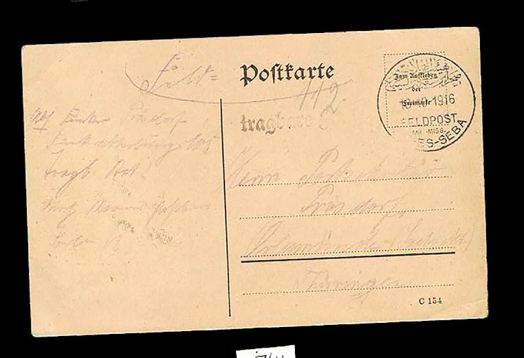 POSTKARTE (Feldpost), from MOBILR RADIO STATION 2, in Beer Sheva October 14, 1916, addressed to Germany with BIR-ES-SEBA cancel. Photo. Estimated Value $200 (Image1)