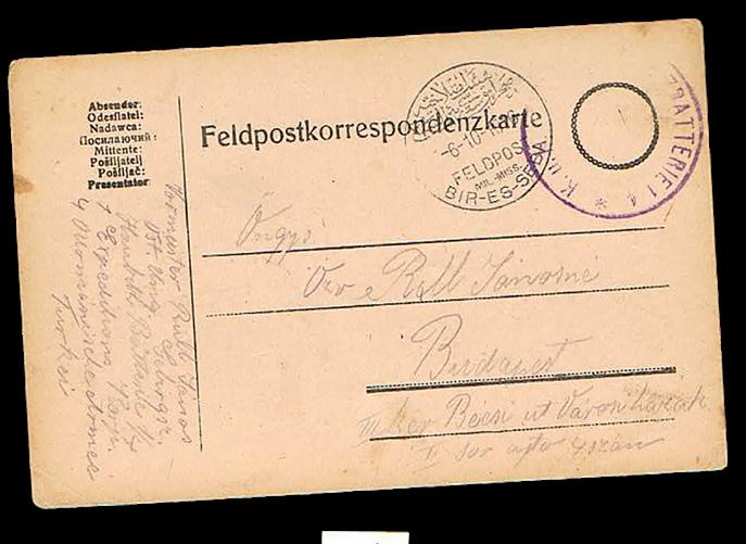 FELDPOST KORRESPONDENZKARTE from Hungarian soldier of the Austro-Hungarian Mountain Haubitzer Battery 1/4 stationed at Beer Sheva, mailed via the German Military Mission Field Post office with first day of