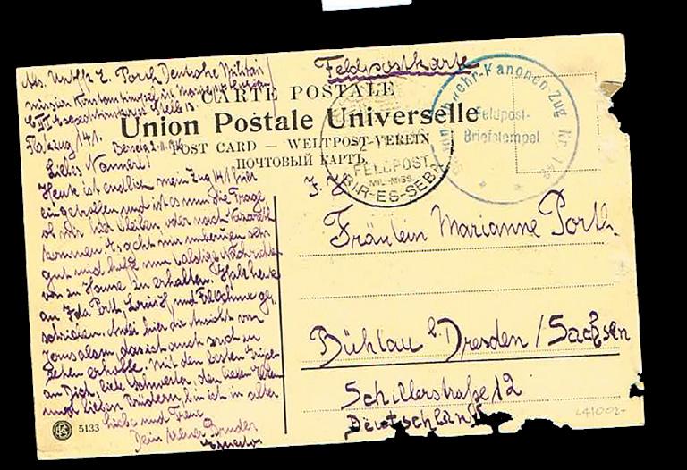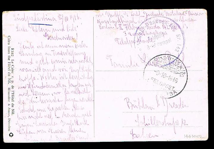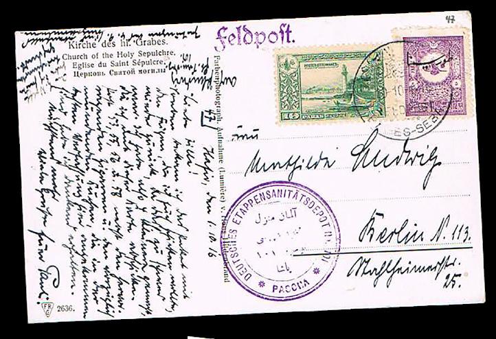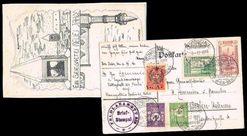 HAND DRAWN POSTCARD, Dec. 6, 1916, from a soldier in Field Hospital 213, in Beer Sheva, mailed to Berlin using (unrequired) Turkish postage stamps as souvenirs. Photo. Estimated Value $400 (Image1)