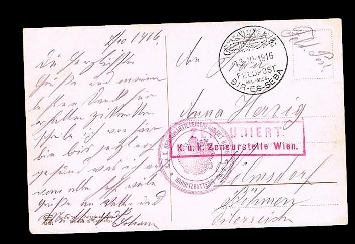 "AUSTRO-HUNGARIAN MOUNTAIN--ARTILERY REGIMENT 6, HOWITZER BATTERY 2"" handstamp on Picture Postcard, MAILED Oct. 13, 1916, mailed through the German Military Mission Field post in BIR-ES-SHEBA to Bohemia, censored