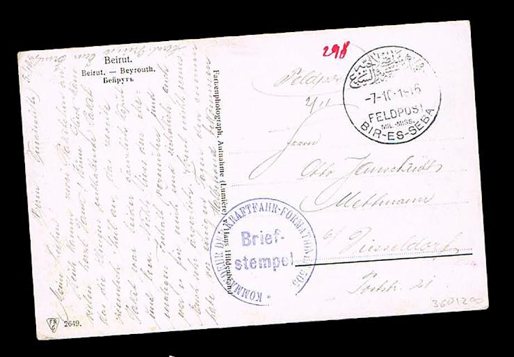 PICTURE POSTCARD written in BIRIN (in Sinai) , Oct. 5, 1916 postmarked BEER SHEVA, Oct. 7, 1916 with BIR-EL-SEBA cancel. Violet handstamp "KOMMANDEUR DES KRAFTFAHR FORMATIONEN 505" and mailed to Mettmear,