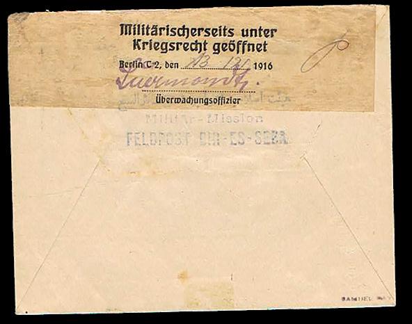 FELDPOST ENVELOPE Nov. 21, 1916, mailed from Beer Sheva to Kiel, Germany with unrecorded 3-line rubber cachet "Milatar--Mission, Bir-Es-Seba" on the reverse. Semi transparent censor tape folded over both sides of