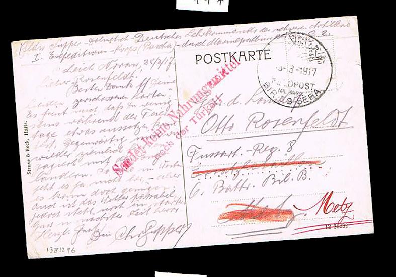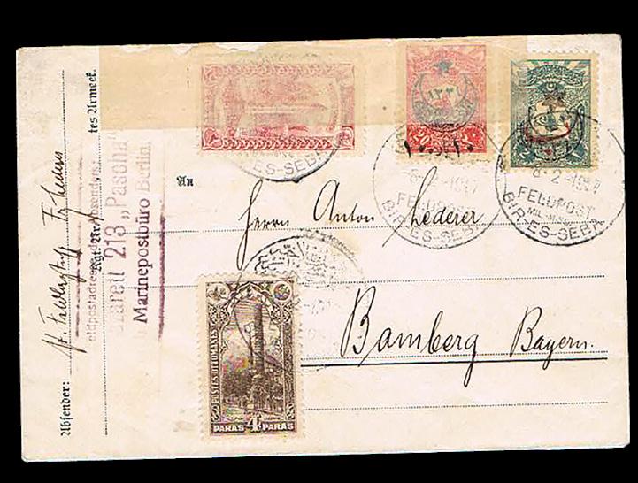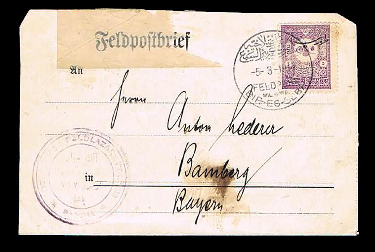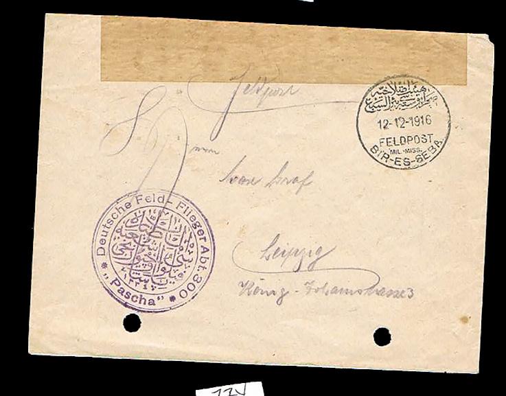 DEC. 12, 1916 cover from BEER SHEVA to Leipzig, with the only known 4-line cachet "German Field Flight Detachment 300 "Pascha"". Also violet handstamp Bale M-20 "DEUTSCHE FELD-FLIEGER ABT. 300 "PASCHA'''
