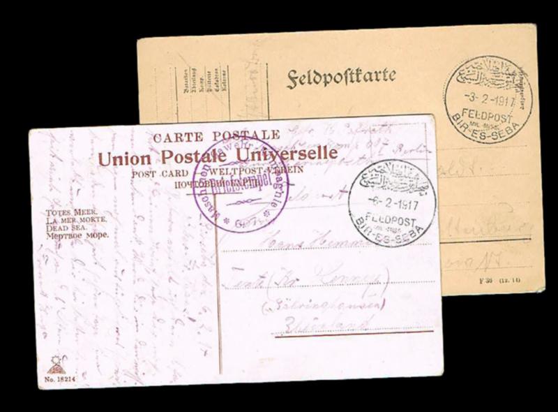 POSTCARDS, 2, from German MACHINE GUN COMPANIES 601 & 602, Both cancelled "BIR-ES-SEBA", Feb. 1917. Addressed to Germany. Photo. Estimated Value $500 (Image1)