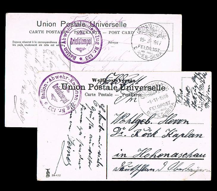 781 PPC imageTWO PICTURE POSTCARDS, 1916 & 1917, mailed from Beer Sheva, with violet handstamp 'ARTILLERY OBSERVATION BALLON TRAN No. 133". Scarce, as these are two of only four known (unrecorded by Ahrens.). Clean. Photo. Estimated Value $700 (Image1)