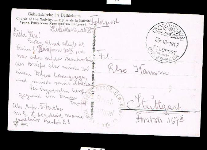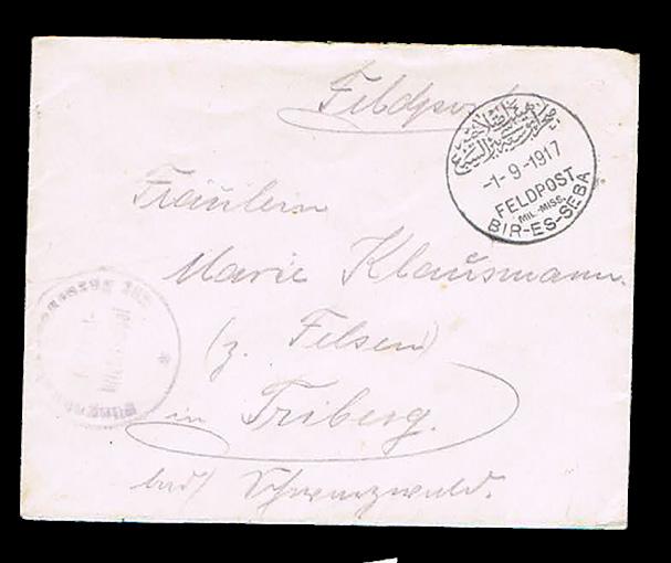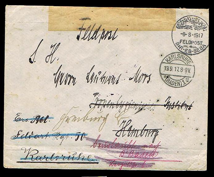 783 c imageCOVER from GENERAL KRESS von KRESSENSTEIN, Commander-in-Chief of all Turkish and German forces in Palestine and Sinai, August 8, 1917, from Beer Sheva, during his visit to inspect the defenses in case of British attack. The only known cover from General Kressenstein! Forwarded several times. Photo. Estimated Value $750 (Image1)