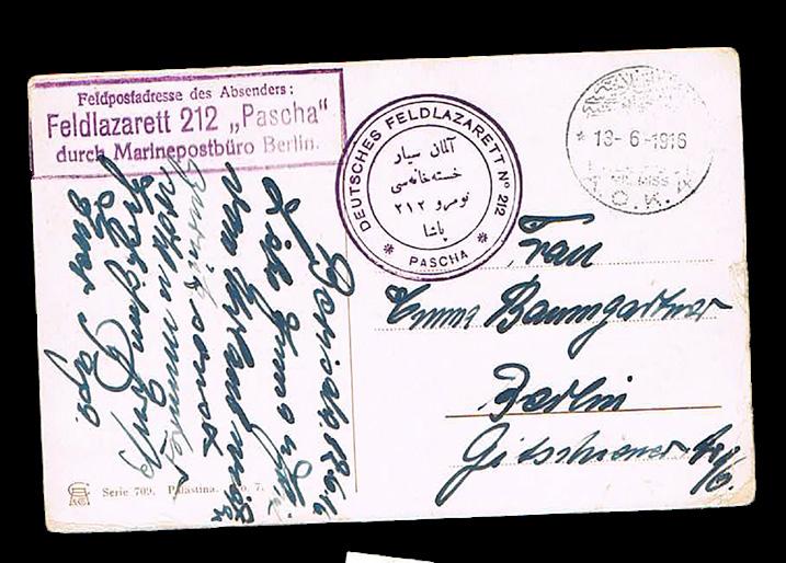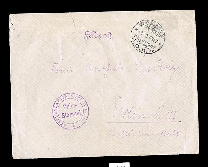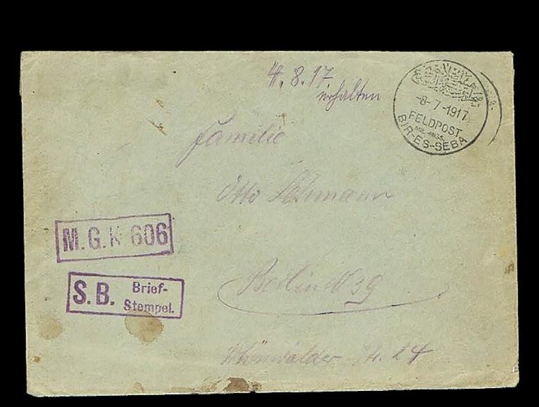 784 c image1917 COVER from a Medic, stationed at the FIELD HOSPITAL 213, Located in the Beer Sheva area, who was probably assigned to the Machine Gun Company 606, deployed to the Beer Sheva region, as evidenced by the unit cachet. Postmarked in Beer Sheva July 8, 1917, mailed to Berlin arrived August 4 (27 days in transit). Some stains, Photo. Estimated Value $300 (Image1)