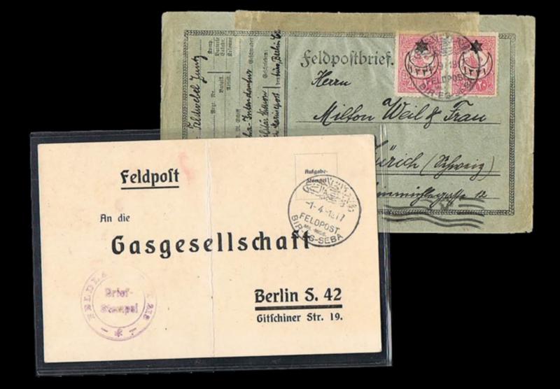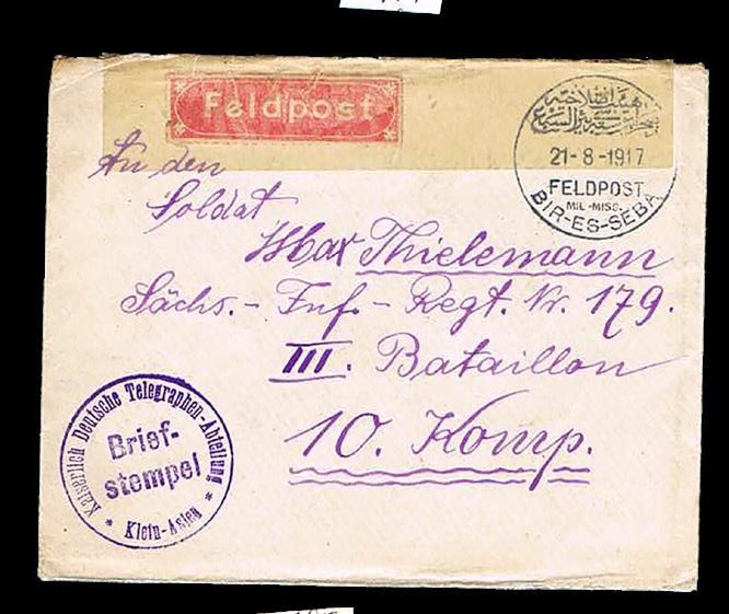 785 c imageIMPERIAL GERMAN TELEGRAPH DEPT., ASIA MINOR, violet cachet on cover addressed to soldier in German army, "BIR-ES-SHEBA" cancel, August 21, 1917, censored in Berlin. Red FELDPOST label. Photo. Estimated Value $500 (Image1)