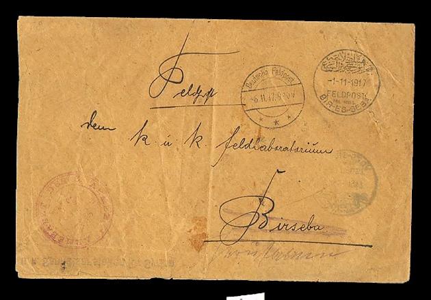 788 c imageOCTOBER 28, 1917 COVER from VIII Army in El Huleikat addressed to BIRSHEBA, with receival cancel Nov. 1, 1917 BIR-ES-SHEBA, forwarded to Germana Feldpost with receival cancel November 6, 1917 "3 STAR/FELDPOST 663). Unusual. Water damage but still unusual. (Certificate Werner Ahrens). Photo. Estimated Value $600 (Image1)