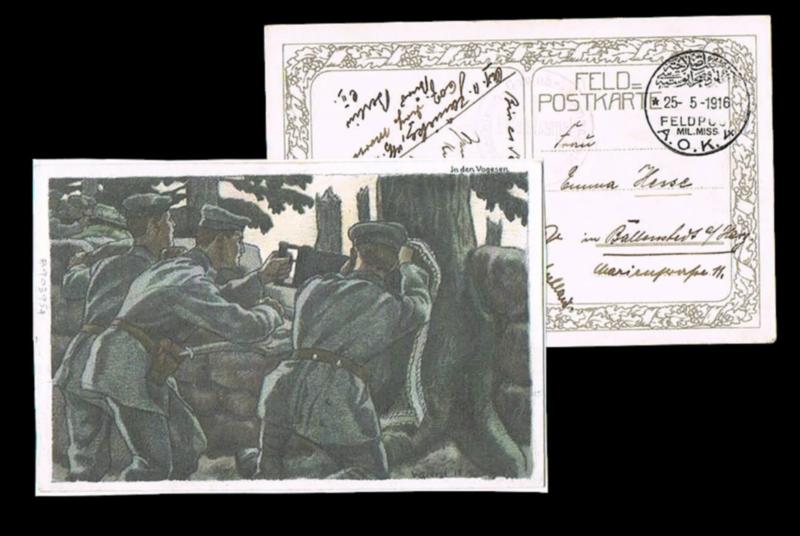 789 PPC imagePICTURE POSTCARD (Shows unit of heavy Machine Gun Company in action), German Fieldpost cancel "A.O.K.4 (Army Ober Kommando) postmark while being used in Beer Sheba in May 1916. From a soldier in Machine Gun unit 607. Photo. Estimated Value $450 (Image1)