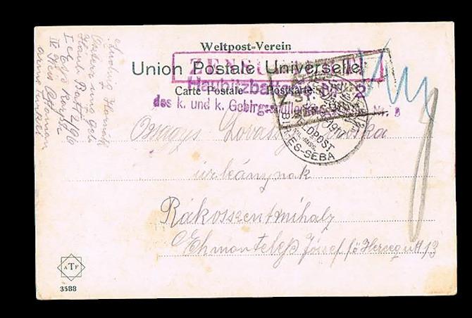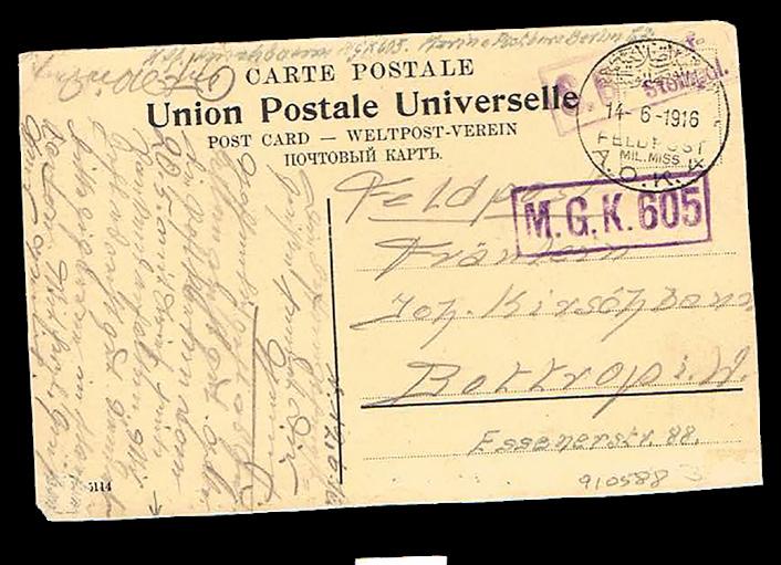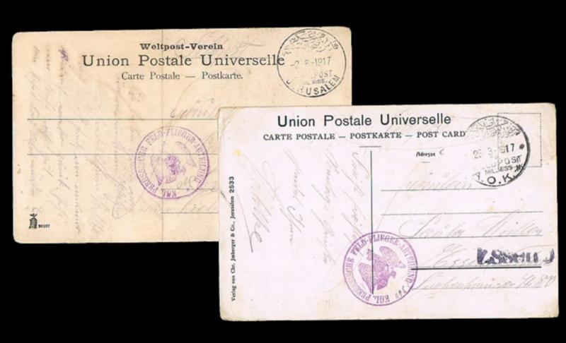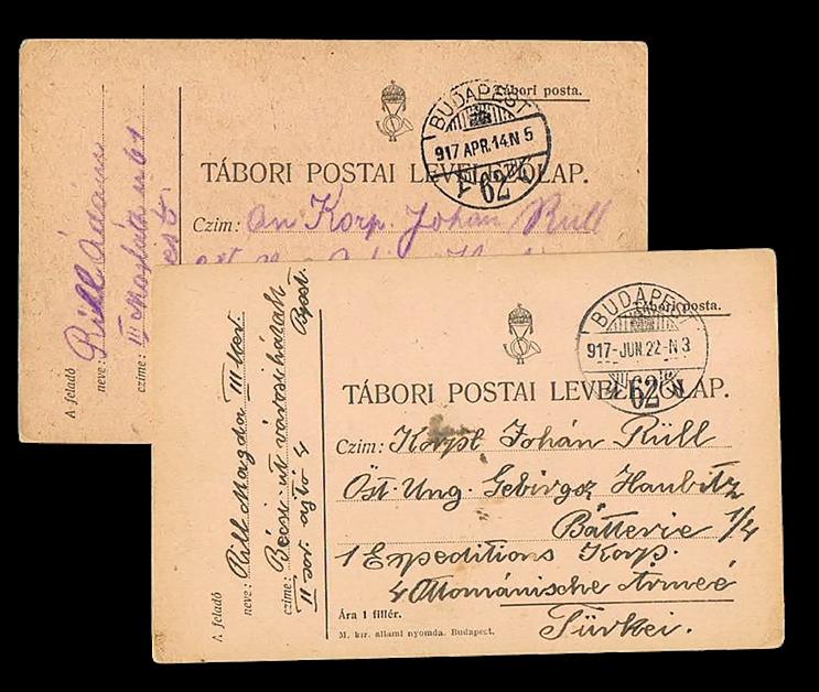 794 PC imageHUNGARIAN MILITARY POSTAL CARDS, 1917 from Budapest, mailed to Austrian--Hungarian Mountain Howitzer Haubitzer Battery, 1st Expeditionary Corps while they were in the Beer Sheba region. Few letters/postcards known sent in the Beer Sheba mail system. Photo. Estimated Value $600 (Image1)