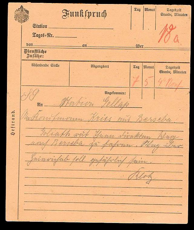 795 DOC imageRADIO MESSAGE (Funkspruch), BERSEBA. Der Station Brukkaros an Oberleutenaant Klotz. Photo. Estimated Vale $200 (Image1)