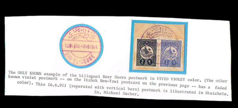 798 pc imageCUTOUTS, Six (6), INCLUDING THE ONLY KNOWN example of the Bilingual Beer Sheva postmark in vivid VIOLET color, June 6, 1911, separated with vertical bars. This postmark is illustrated in Steichele (ex Michael Sacher).Interesting lot. Photo. Estimated Value $1000 (Image1)