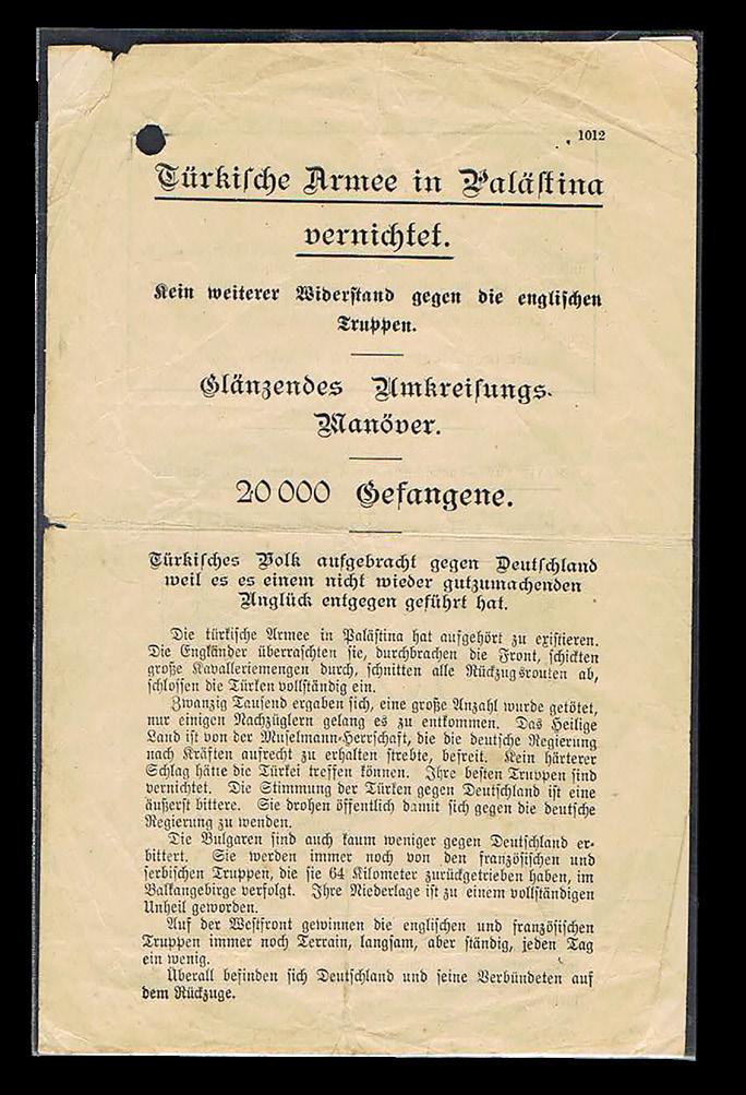 799 doc imageBRITISH PROPAGANDA FLYER DROPPED OVER GERMAN ARMY 1918, "Turkish Army in Palestine destroyed, 20,000 captured during flanking of Beer Sheba". Historical document, extremely scarce. Slightly rough condition, file hole. Photo. Estimated Value $1000 (Image1)