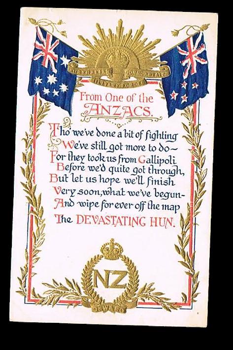EMBOSSED COLOR PICTURE POSTCARD, "From One of the ANZACS" with large "NZ"at the bottom. "Very soon, what we've begun--and wipe forever off the map, The DEVASTATING HUN". Unused. Photo. Estimated Value $250 (Image1)