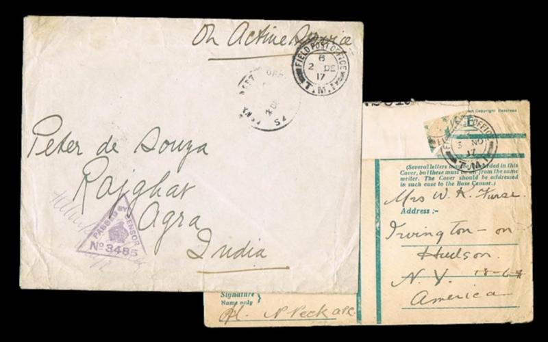 TWO COVERS, 1917, addressed to India and America from Australian units, FPO T.M.I. OF THE ANZAC Mounted Division Train. Censored, transit backstamps. Photo. Estimated Valus $500 (Image1)