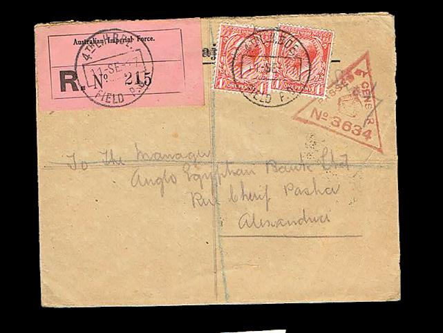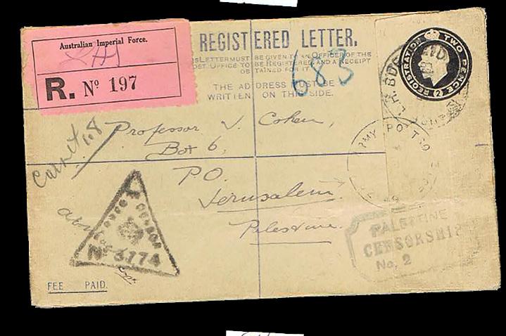 REGISTERED POSTAL ENVELOPE, 2p,, with Australian Imperial Force pink registration label, August 20, 1918. Backstamps APO SZ44 (Jerusalem). Censored. Photo. Estimated Value $500 (Image1)