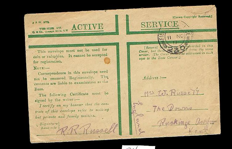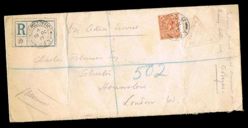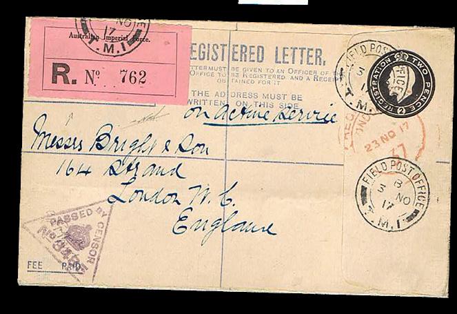 REGISTERED POSTAL ENVELOPE, 2p, with Australian Imperial Force pink registration label, Nov. 3, 1917, with cancels FPO T.M.I.. Censored. Transit and TPO backstamps. Photo. Estimated Value $500 (Image1)