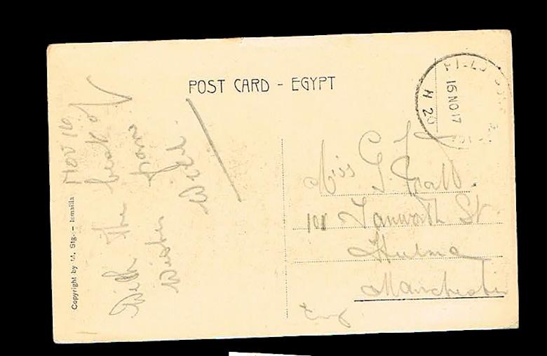 PICTURE POSTCARD, small size, used by soldier on the railhead from Rafa to Beer Sheba, Oct. 9, 1917, 3 weeks prior to the conquest of Beer Sheva. Postmarked APO SZ 8, by the Army Base Post Office Palestine Line of