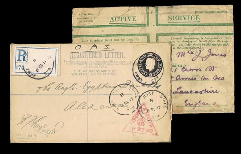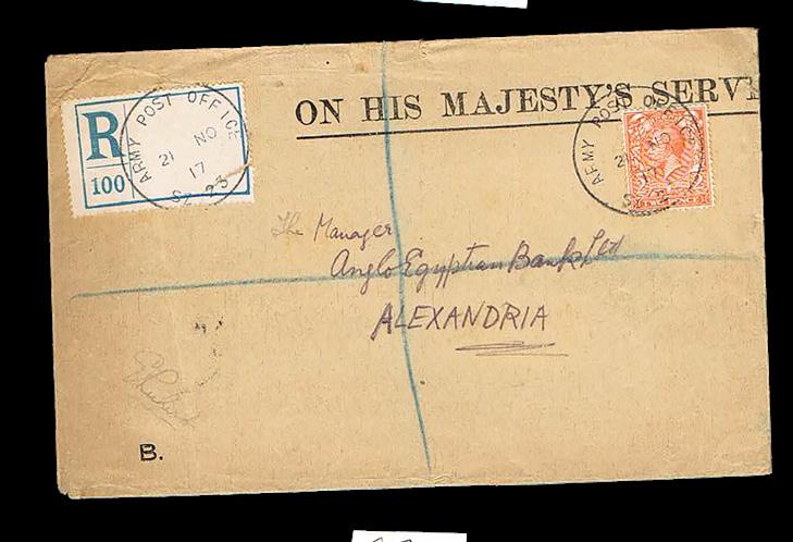 REGISTERED COVER, from Beer Sheva to Alexandria, postmarked APO SZ23, Nov. 21, 1917. Receival backstamps Base Army Post Office "Z" 25 Nov. 25, 1917, and Alexandria. (Latest known date on cover of APO SZ23). Photo.