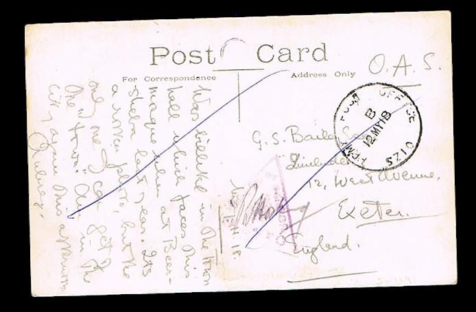 PICTURE POSTCARD (same as previous lot) mailed May 11, 1918 from Beer Sheva, cancelled APO SZ10, May 12, 1918 (Advanced Base Post Office, Cairo) in Beer Sheba Photo. Estimated Value $200 (Image1)