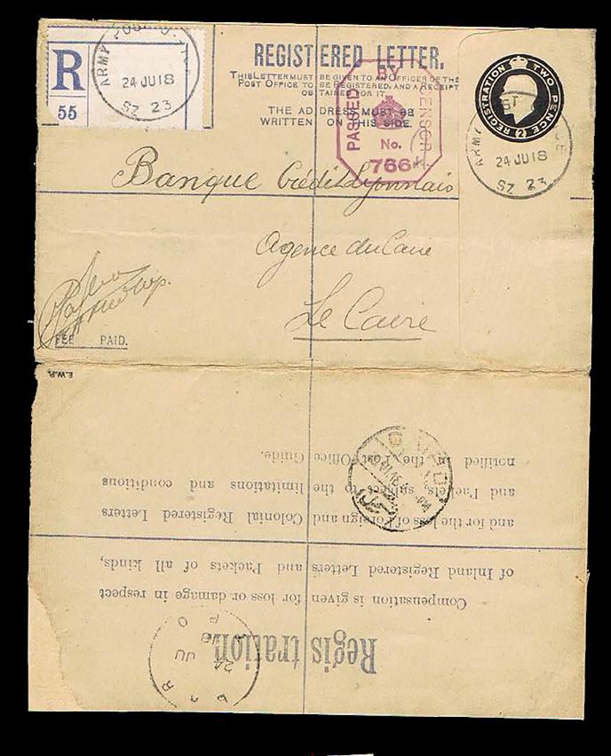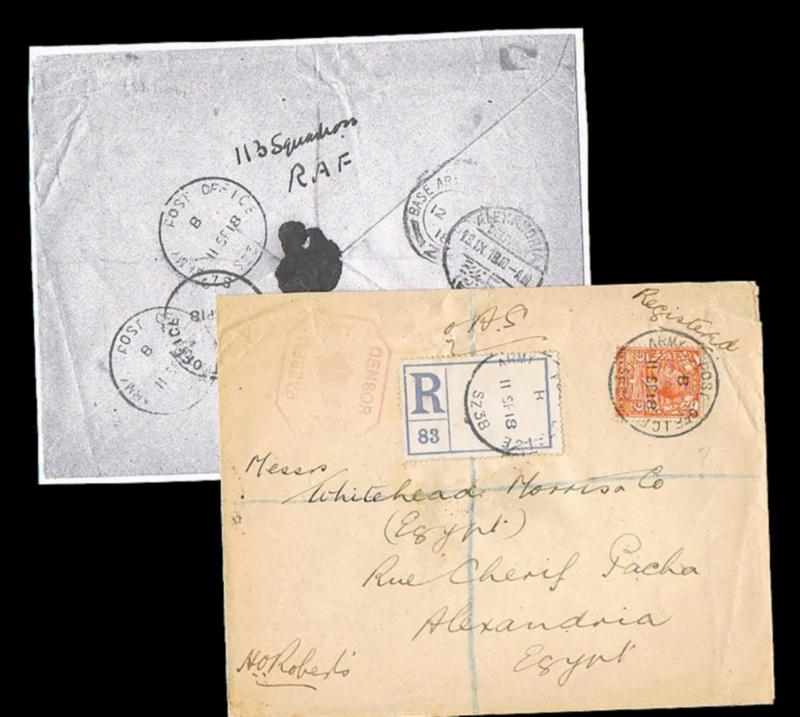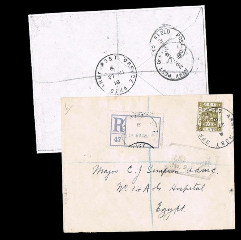 823 c imageREGISTERED COVER from Jerusalem to a Major in the 14tth Australian General Hospital (Port Sais), postmarked SZ44, Aug. 27, 1918. Backstamps including SZ23, Aug. 29, in transit in Beer Sheva. Latest known date of SZ23. Photo. Estimated Value $150 (Image1)