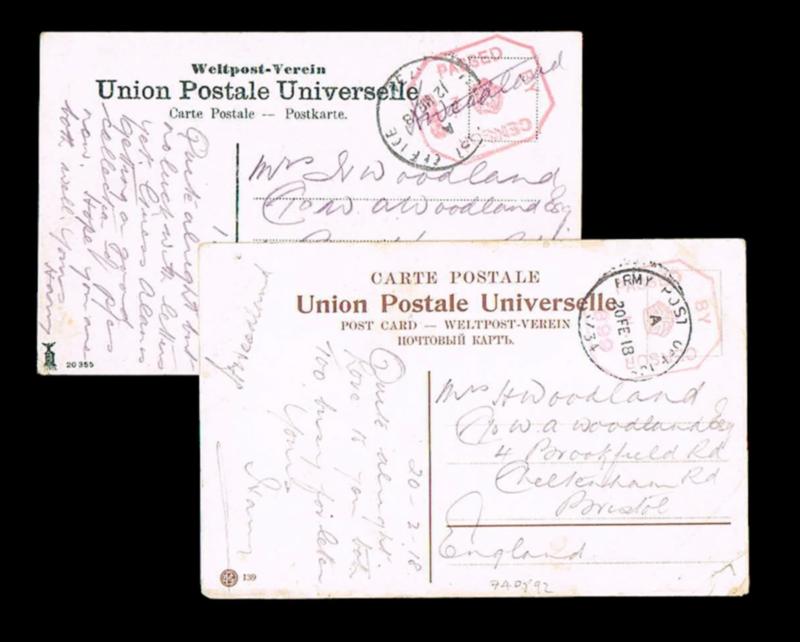 822 PPC imageTWO PICTURE POSTCARDS, cancelled APO SZ34, located in Beer Sheva from Dec. 1917 to April 6, 1918. Both addressed to England. Photo. Estimated Value $250 (Image1)