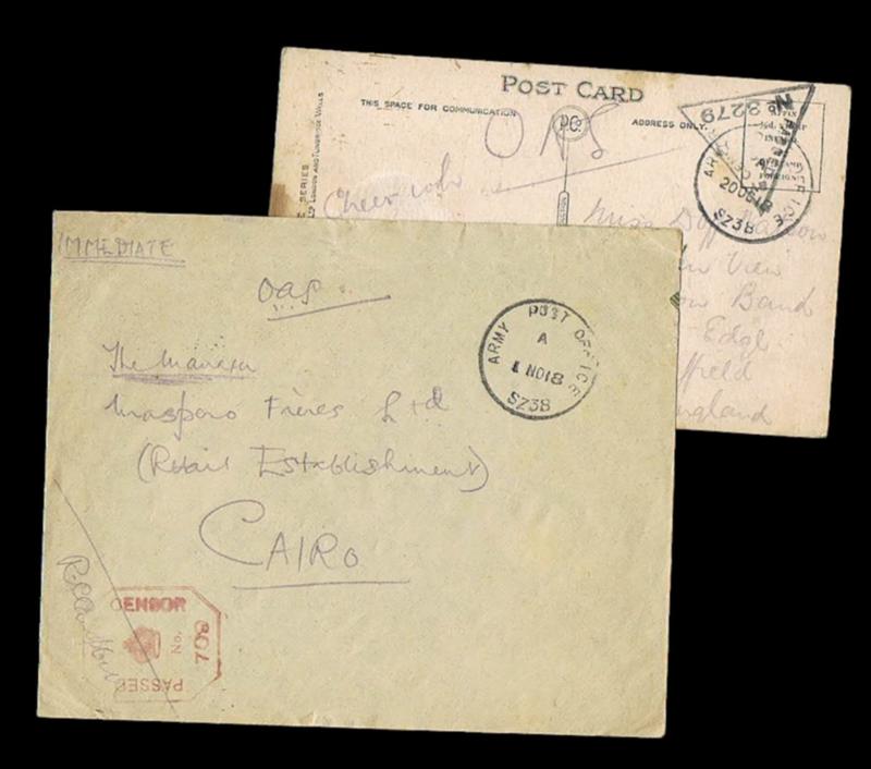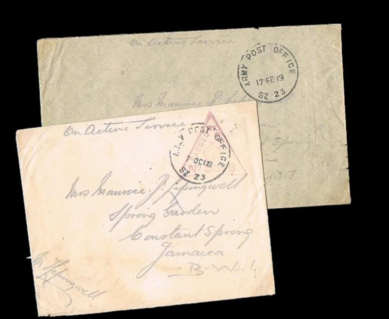827 c imageCOVERS TWO, cancelled APO SZ23 located in Beer Sheva, both addressed to JAMAICA with receival backstamps. Most unusual. Censored. Photo. Estimated Value $500 (Image1)