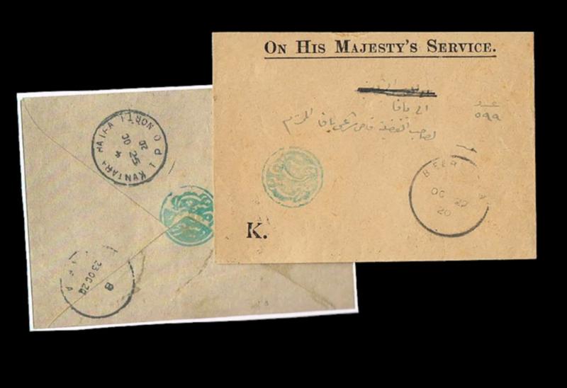 828 c imageSTAMPLESS OFFICIAL SHARIA COURT cover from Beer Sheva that travelled via Beer Sheva-RAFA railway line to RAFA Oct. 23, 1930, and then via KNATARA--HAIFA TPO NORTH, Oct. 25, 1920 to Jaffa to the Sharia Quadhi Pasha. The only known civilian cover mailed on the BEER SHEVA--RAFA railway line. Only three covers exist with the RAGA postmark exist. Photo. Estimated Value $250 (Image1)