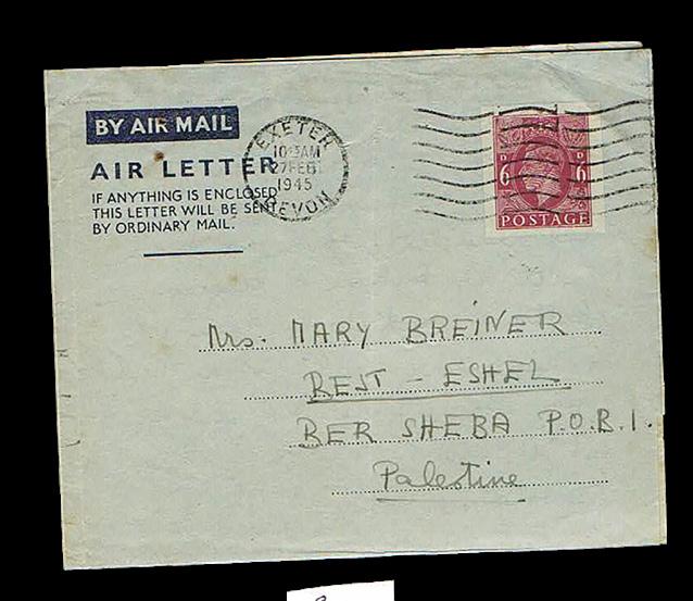901 als imageAIR LETTER SHEETLET from England, March 10, 1945 addressed to BEIT ESHEL, PO Box 1. In the early 1940's the Jewish Agency purchased land in Beer Sheva and in 1943 the settlement BEIT ESHEL was founded, on the southern outskirts of Beer Sheba, and at that time hired the P.O. Box 1, Beer Sheva Photo. Estimated Value $200 (Image1)
