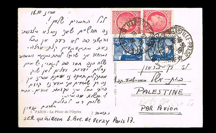 902 PPC imagePICTURE POSTCARD from France to BEIT ESHEL postmarked October 19, 1947. Re-directed to Tel Aviv, because toward the end of 1947, it became to dangerous for Jews to enter Beersheba, and had all their mail forwarded to PO Box 560, Tel Aviv. At the beginning of 1948 all women and children were sent north to Kfar Vitkin and all normal post mail service to Beit Eshel was stopped and all mail travelled in both directions only occasionally when carried by patrols or piper airplane! Photo. Estmated Value $100 (Image1)
