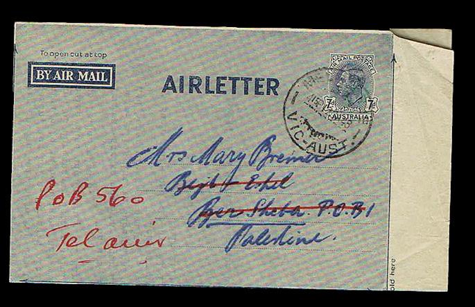 903 als imageAIRLETTER SHEET from Australia to Beit Eshel, postmarked January 12, 1948, redirected to Tel Aviv, POB 560, as no service available to Beer Sheva. Photo. Estimated Value $300 (Image1)