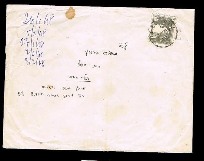904 c imageCOVER FROM BEIT ESHEL to evacuated family in Tel Aviv, franked with 10m Palestine stamp. Carried by COURIER to Tel Aviv, Feb. 5,1948. Docketed dates indicate dates of writing the letters contained in the envelope. Photo. Estimated Value $200 (Image1)