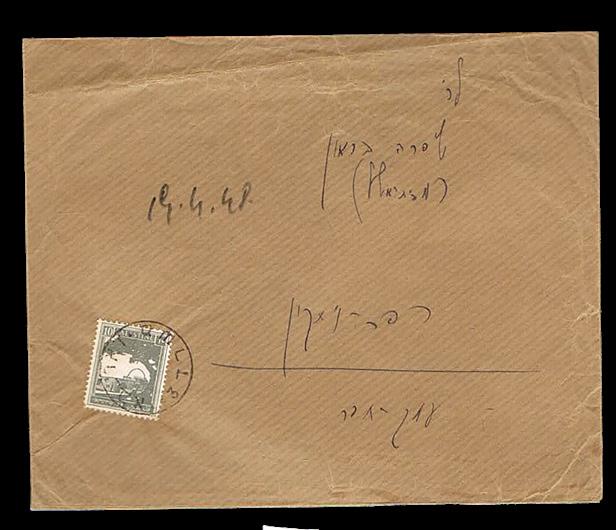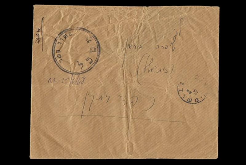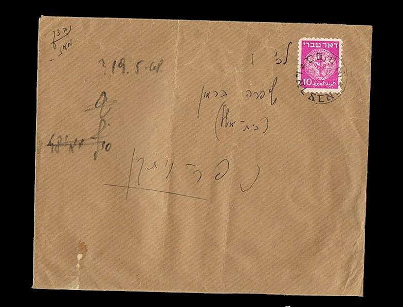 908 c imageCOURIER COVER from besieged Beit Eshel written on May 3, 1948 addressed to evacuated family in Kfar Vitkin. Cover carried out of Beit Eshel by Courier who slipped across Egyptian line and who enroute affixed a Doar Ivri stamp. Another courier took it to Jerusalem (prior to Doar Ivri stamp reached that city) and was postmarked "MINHELETET HA'AM, DOAR, JERUSALEM", June 16, 1948. Scarce, Photo. Estimated Value $750 (Image1)