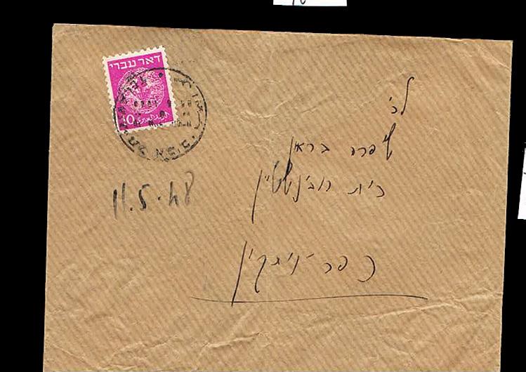 906 c imageCOVER FROM BEIT ESHEL of May 11, 1948 (4 days prior to Independence) to family in Kfar Vitkin. Franked by the COURIER with Doar Ivri 10m stamp, tied by Tel Aviv May 25, 1948 cancel. Photo. Estimated Value $300 (Image1)