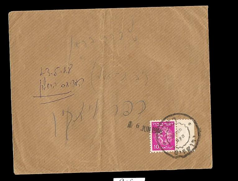 905 c imageAPRIL 19, 1948 COVER sent from Beit Eshel to evacuated family in Kfar Vitkin. Franked with 10m Palestine stamp. Carried by COURIER who delivered it to the pre-state miitary postal service in Tel Aviv, receival postmark "Doar Tvai Misrad 3" (Army Post Office 3) in use from May 22, 1948--May 25,1948. Photo. Estimated Value $300 (Image1)