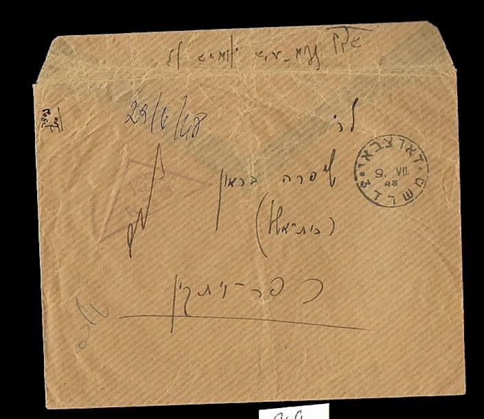 909 c imageCOURIER COVER from besieged Beit Eshel of June 29, 1948 sent to family in Kfar Vitkin, approved by "Nivdak, Maaz". Postmarked by the Negev Brigade 8th Regiment military triangular "KABA" 165 hand stamp, and "Doar Tzvai, Misrad 3" (Army Post Office in Tel Aviv), July 9, 1948. Photo. Estimated Value $300 (Image1)