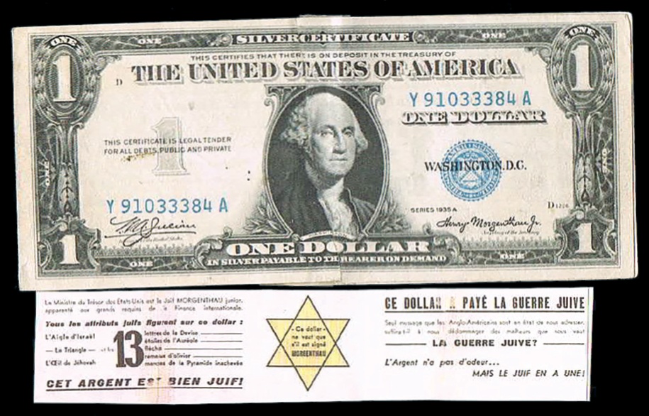 878 doc imageU.S. DOLLAR FACSIMILE, with message inside in French, "IT'S A JEWISH WAR!", dropped over France by the Nazis. Scarce. Has reinforcements inside. Photo. Estimated Value $500 (Image1)