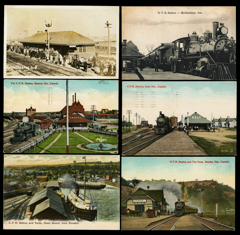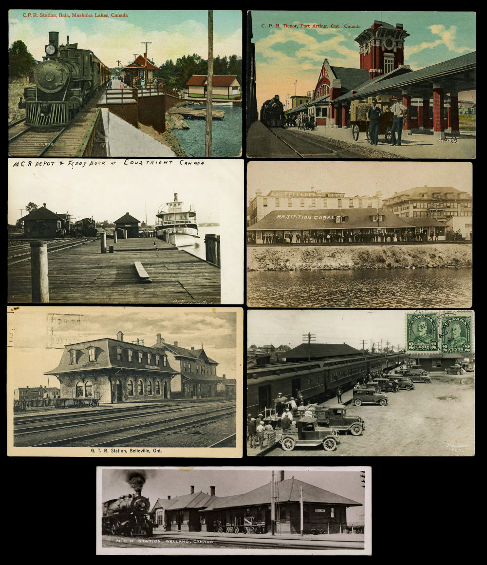 382 image70 CANADA RAILROAD STATION POSTCARDS 1905-1930's, the majority are from Ontario with many better small town stations noting Tomico, Westboro-CPR, Haileybury-T&NO, Bala-CPR, Cobalt, Courtright with ferry dock, Welland-MCR bookmark card, Hawkesbury-GTR, Kenora-CPR ++, also Alberta stations at Jasper-GTR and Lake-Louise-CPR, plus the PEI station at Kensington ++, ex Rogan collection retailing over $490 US ($700 CDN), F-VF est (Image) (image 382b) (All Images)