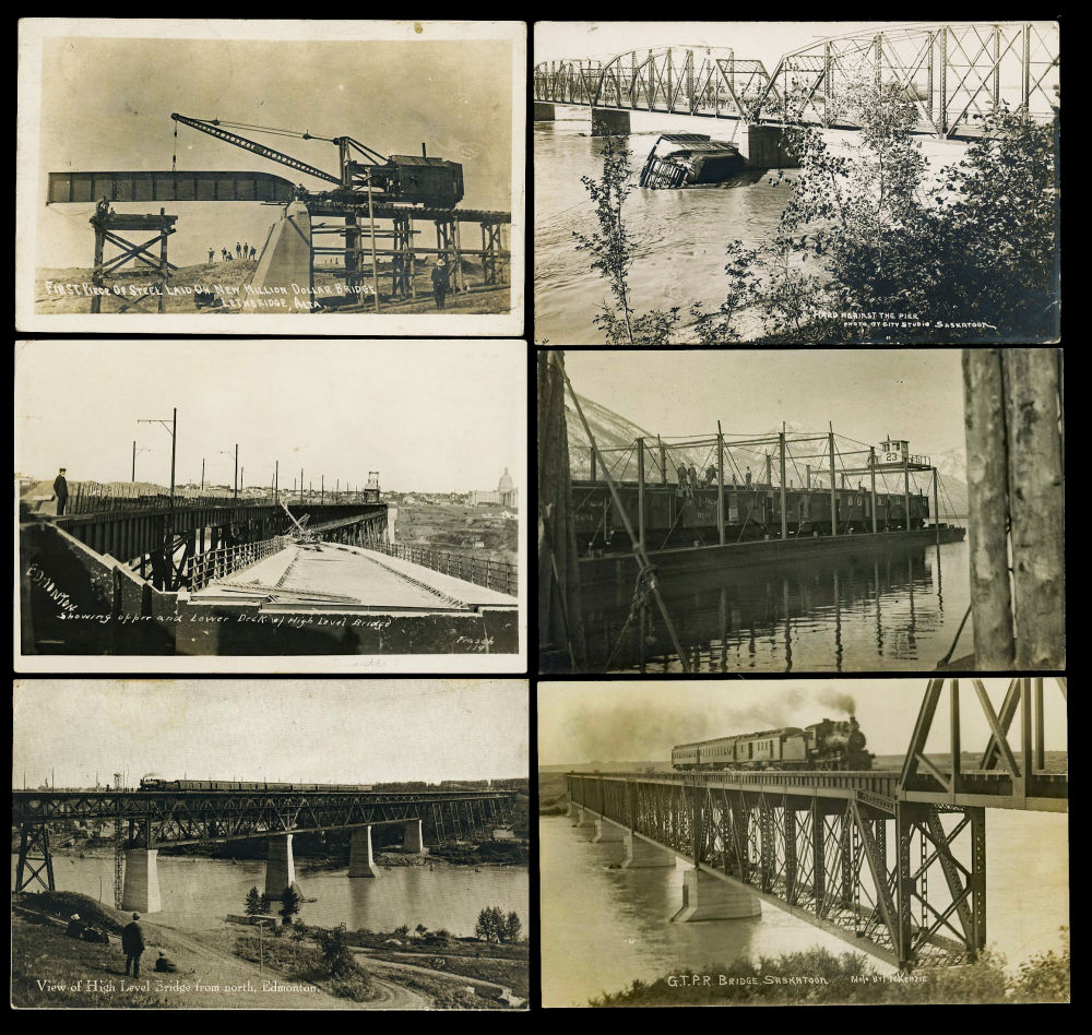 384 image12 RAIROAD BRIDGE POSTCARDS 1905-1914, all early view noting 10 are B&W real photo cards, includes the Duhamel-Que 4000 foot trestle, 1908 Pheasant-Creek-ASSA trestle, 1908 Saskatoon Bridge with the City-of Medicine-Hat river steamer wrecked on the bridge pilings, 1906 Saskatoon Railway bridge collapse, 1908 Lethbridge-Alta 5500 foot CPR trestle construction, 1910 construction of the Edmonton Upper Level railroad bridge, 1914 CPR Outlook-Sask CPR bridge, 1911 Kirkfield-Ont lift locks, 1910 CPR train ferry, ex Rogan collection retailing over $200 US ($275 CDN), F-VF est (Image)