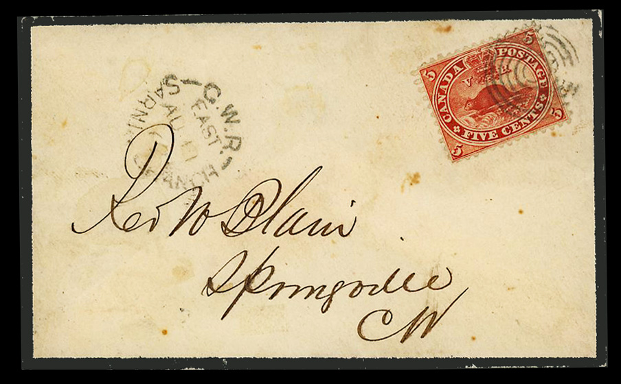 386 image1862 G.W.R. SARNIA-BRANCH EAST (Gray #RY-81 1859-1875 RF-C2), a choice split ring dated AUG-11-1862 on a #15 franked mourning cover to SPRINGFIELD-CW via PORT-HOOD-CW the next day, retails $75 US ($100 CDN), VF est ($50+ US) (Image)