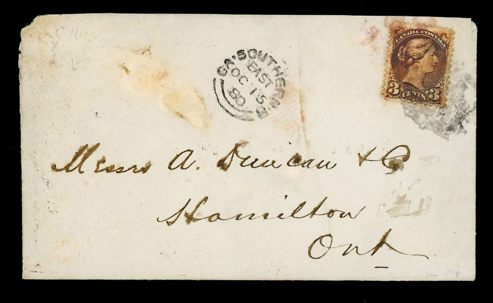 387 image1880 CA-SOUTHERN-R EAST (Gray #RY-33 1874-1886 RF-C), VF split ring on #37 franked cover dated OCT-15-1980 to HAMILTON with same day arrival, retails $75 US ($100 CDN), small nick on UL corner, F-VF est ($50+ US) (Image)
