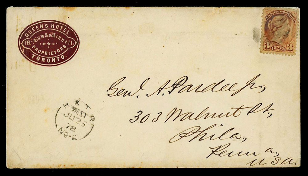 388 image1878 H. & T. R. No.2 WEST (Gray #ON-209.02 1875-1881 RF-D), choice split ring dated JUN-26-1878 on a QUEENS HOTEL advertising cameo cover addressed to Union General A. Pardee Jr. (1839-1907) in Philadelphia with arrival on JUN-28, Pardee has historical significance where he rose to fame at the Battle of Gettysburg, retails $100 US ($150 CDN), VF est ($75+ US) (Image)