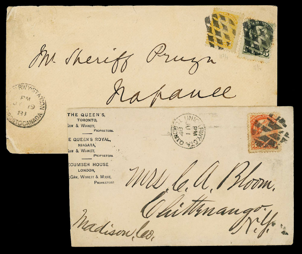 389 image2 RPO TORONTO UNION STATION CORK CANCELS, includes an 1881 large 27mm UNION RWY STATION TORONTO CANADA cds h/s on a 6¢ double rate cover to NAPANEEE from the INSPECTOR of ASYLUMS & PRISONS noting VF diamond grid corks, also an 1884 UNION RWY STN TORONTO small cds dated JUN-1-1884 on cover to USA with a fancy geometric cork, both covers with LHS trims that do not affect the corks, retails $150 US ($200 CDN), F-VF est ($100+ US) (Image)