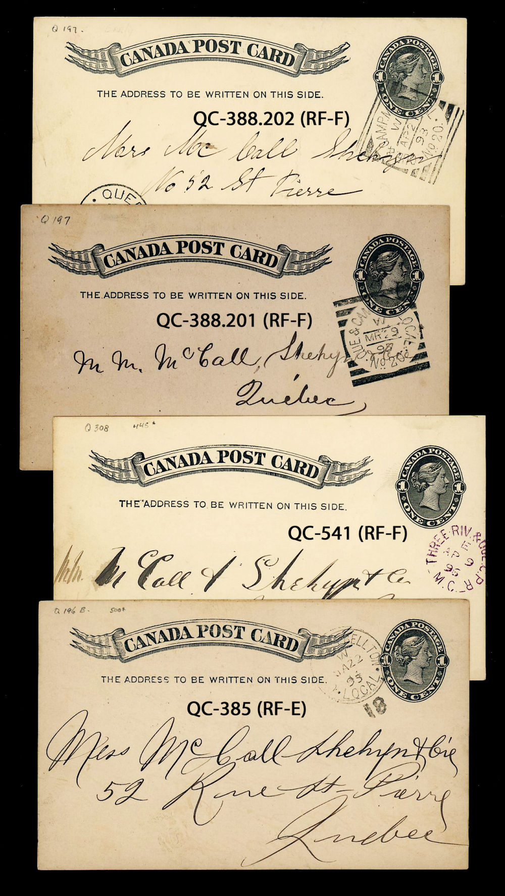 390 image4 RARE QUEBEC RPO CANCELS 1895-1898, all on postal cards from various locations addressed to QUEBEC-CITY, includes Gray #QC-385 (1894-1895 RF-E), #QC-541 (1895-1896 RF-F), squared circle #QC-388.201 (1894-1895 RF-F), and squared circle #QC-388.202 (1895-1898 RF-F), a great lot for the Quebec RPO collectors, retails over $300 US ($400 CDN), F-VF est ($75+ US) (Image)