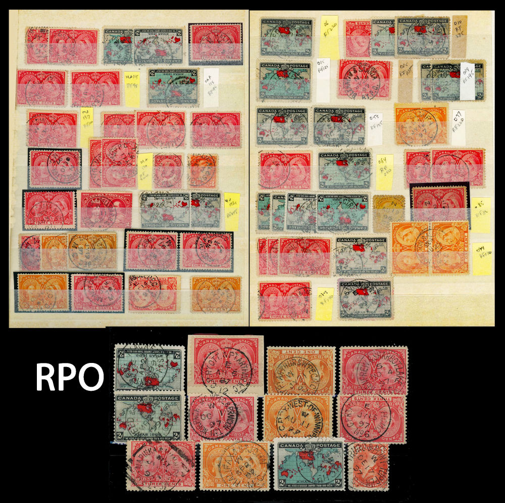 391 image397 RAILROAD POST OFFICE CANCELS 1896-1903 (a few later), completely unchecked lifetime accumulation on 10 Small Queen stamps, 248 Victoria Jubilees, 113 Map stamps, 4 Leaf-Numerals, a few KEVII-KGV-KGVI issues, and 11 QEII covers, Scott cat over $1700 US ($2400 CDN) for the stamps alone, a choice unpicked lot with F-VF est ($200+ US) (Image)