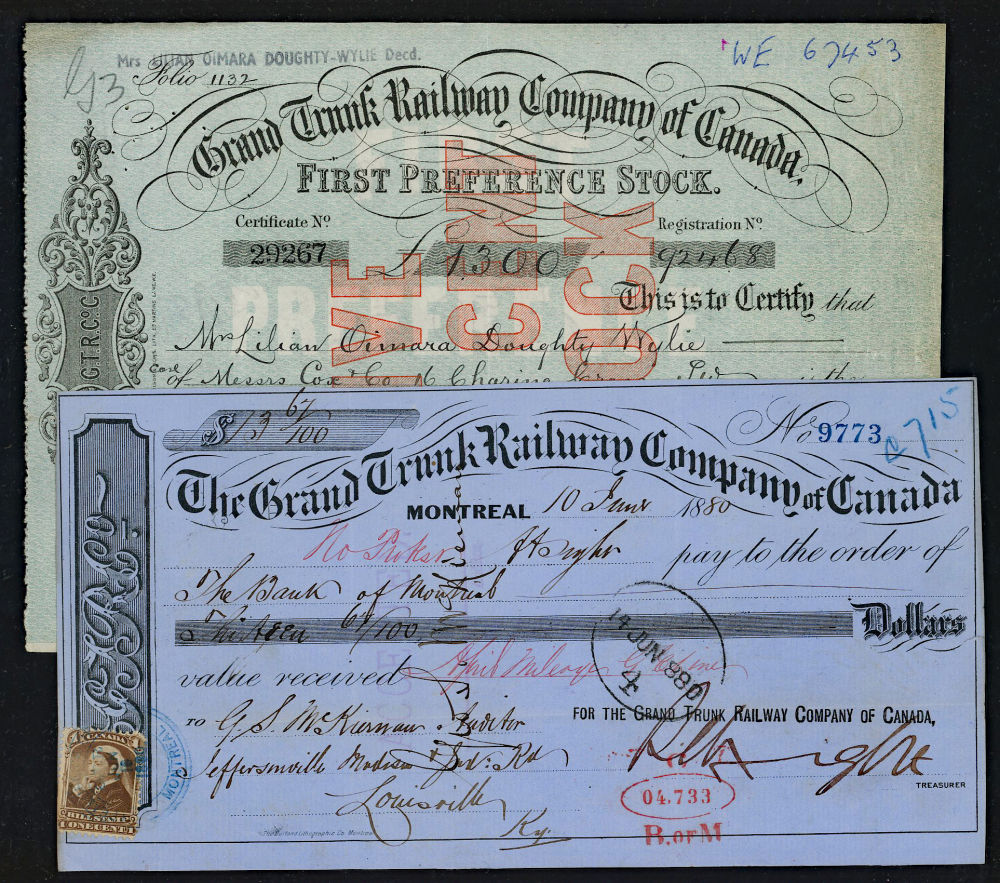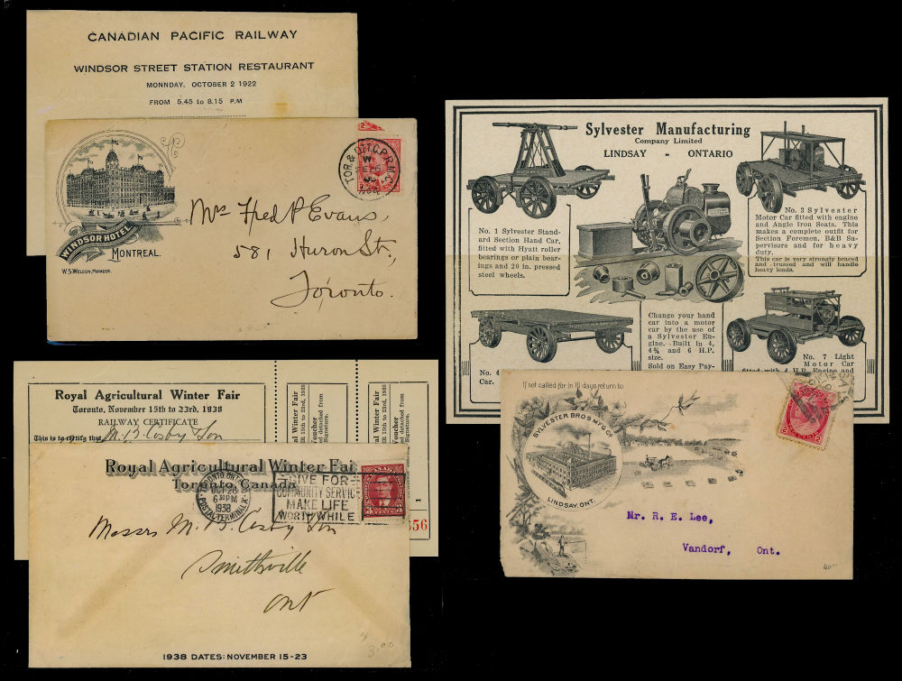 392 image6 RAILROAD RELATED ITEMS, 1861-1938, includes an 1861 GTR delivery invoice to deliver 600 lbs of pork from Quebec-City to Somerst-Station ($1.44 fee), an1880 GTR $13.67 cheque to Louisville-Ky with a 1¢ Canada tax stamp, a 1908 GTR £1300 stock certificate, a 1901 Sylvester Mfg cover with product advertising contents, a 1938 Toronto Winter Fair advertising cover with a fair ticket enclosed, a 1906 Montreal CPR Windsor Hotel advertising cover, a 1922 Windsor Hotel restaurant music program ++, retails over $150 US ($200 CDN), F-VF est (Image) (image 392b) (All Images)