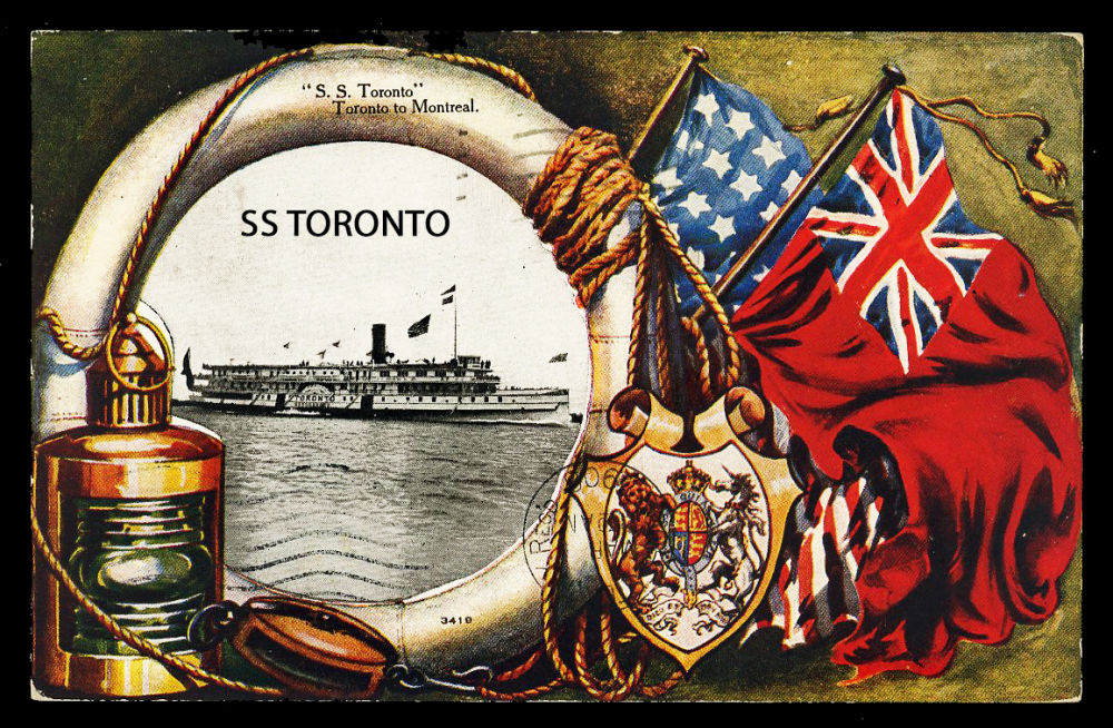393 image1908 SS TORONTO, Warwick flag patriotic postcard showing the Lake Ontario and St-Lawrence River steamer, posted at TORONTO on FEB-29-1908 to USA, retails $50 US ($75 CDN), VF est ($35+ US) (Image)